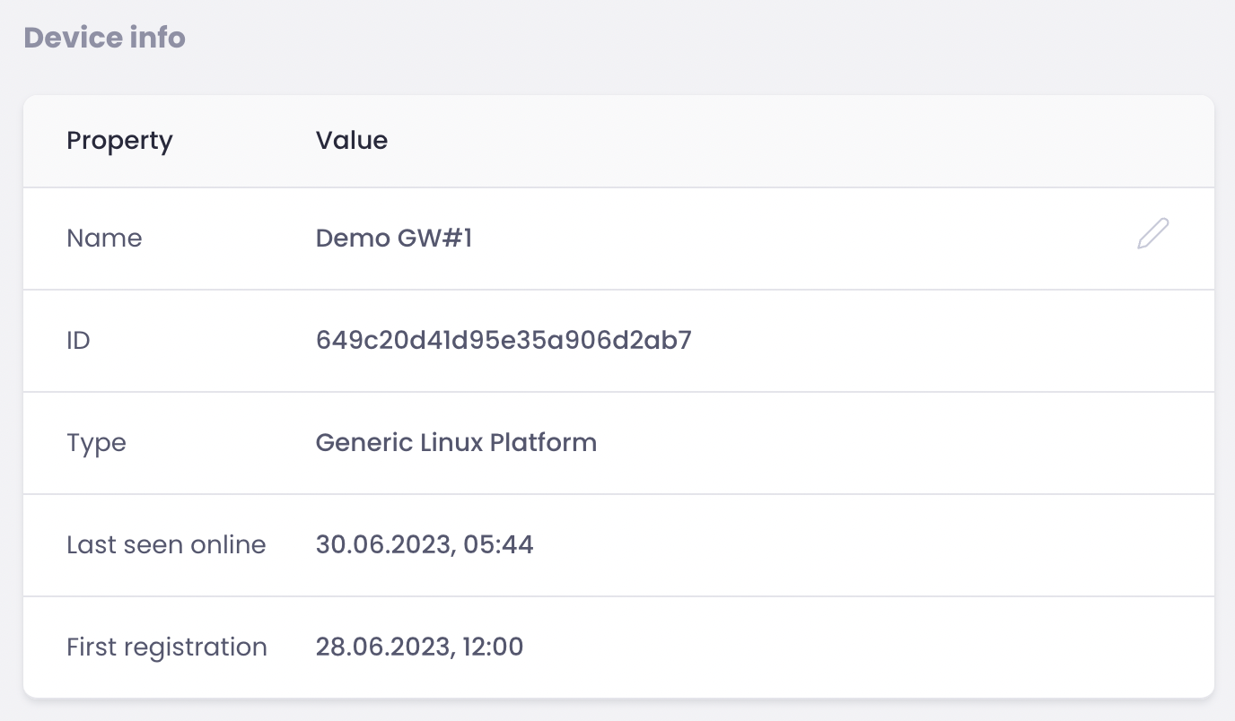 Device info – contains the same information as in the Overview tab with the addition of the hostname listed;