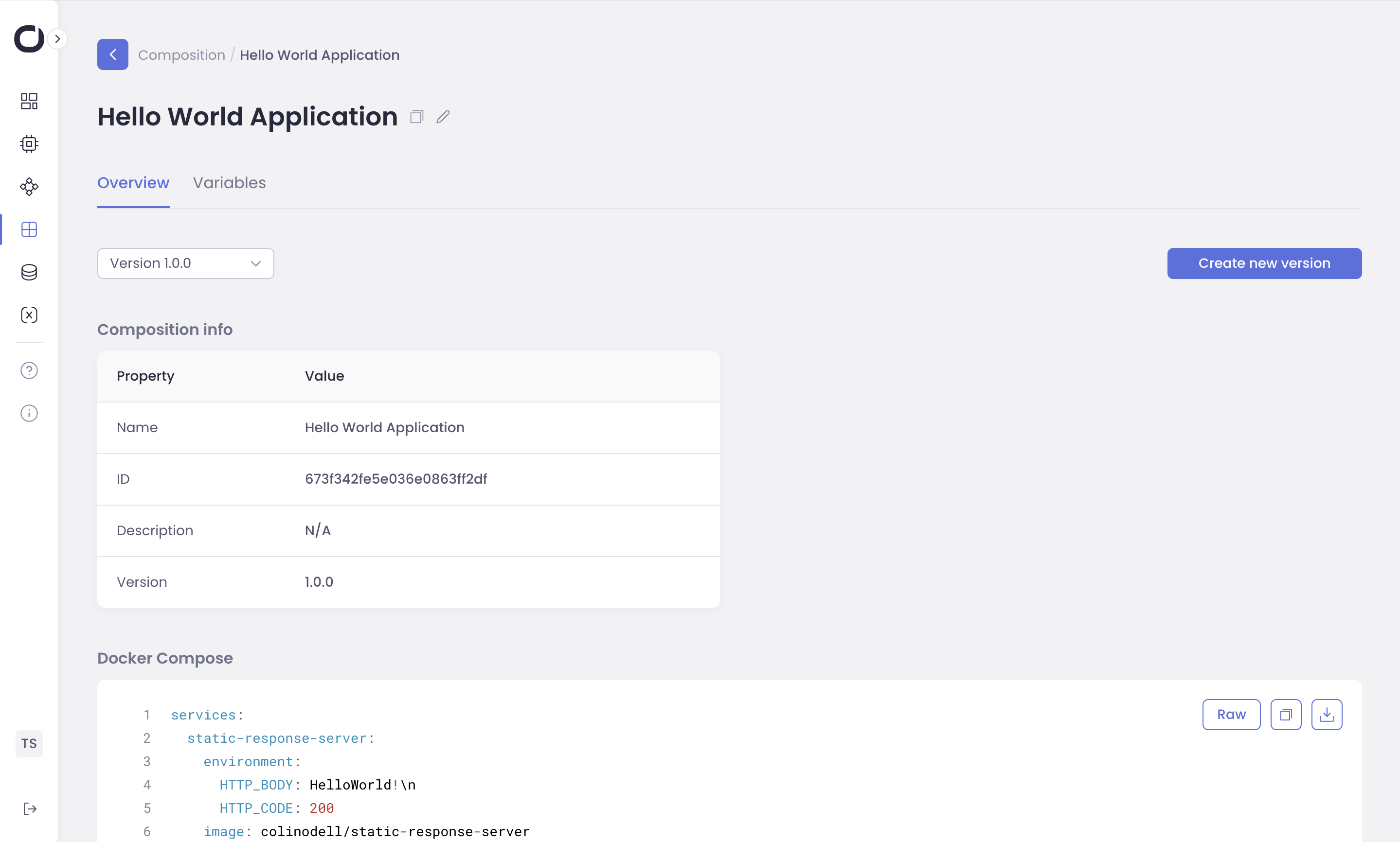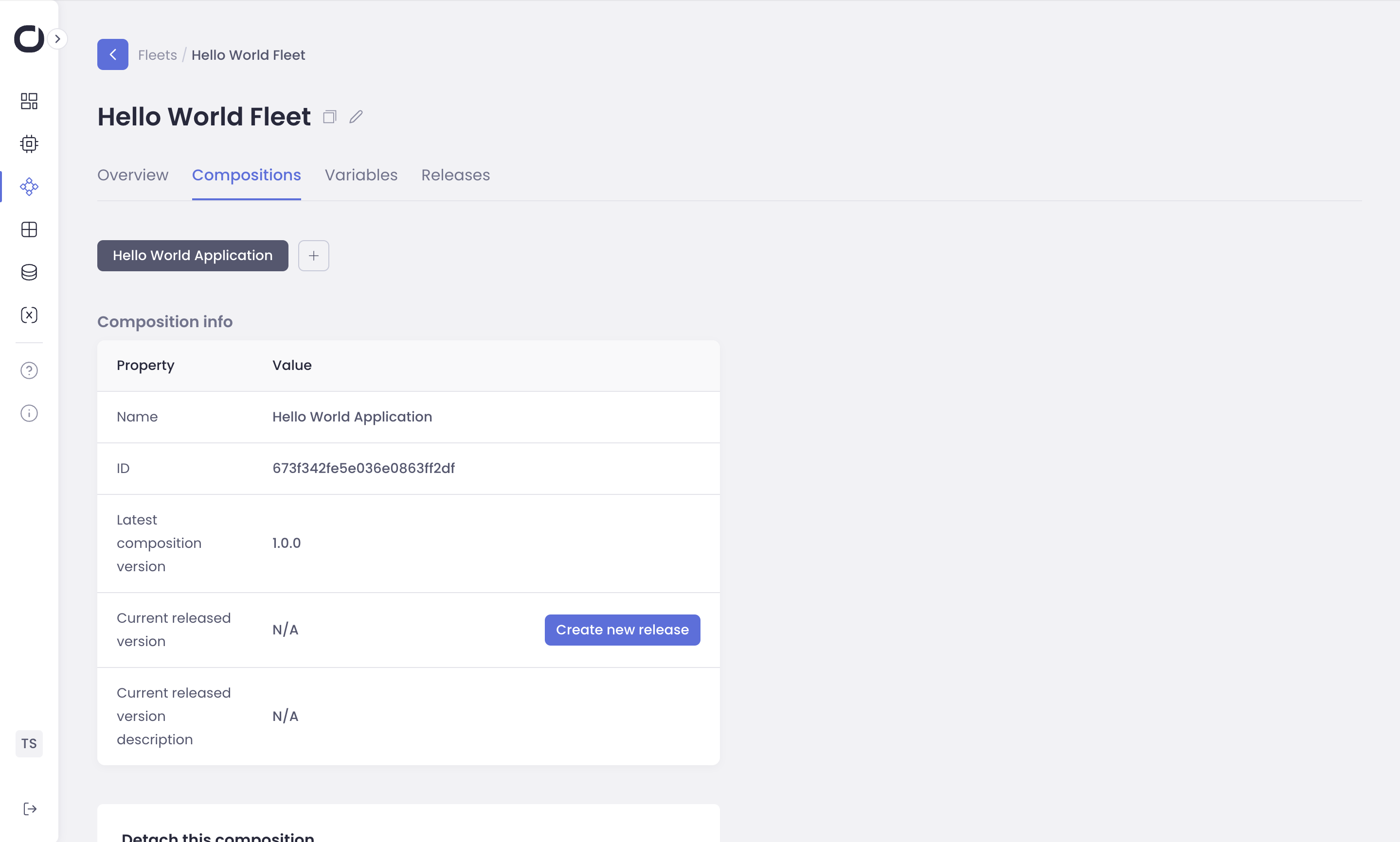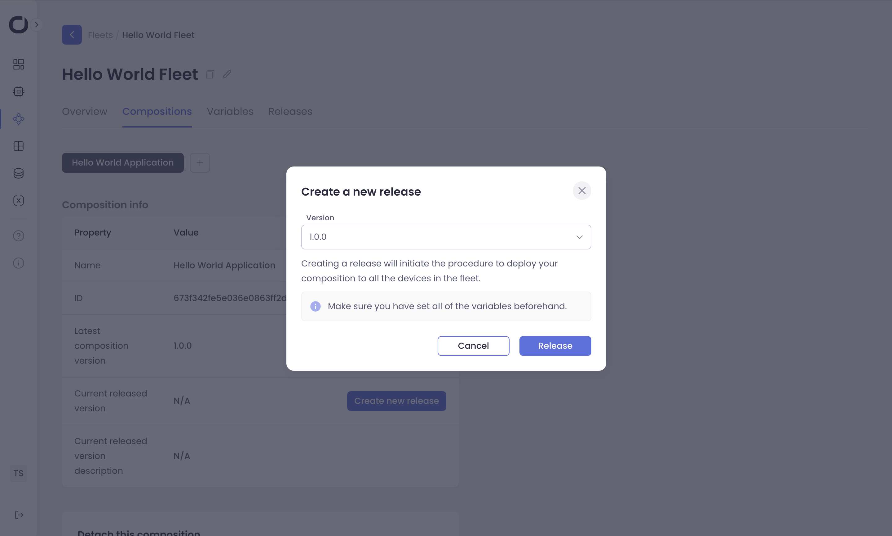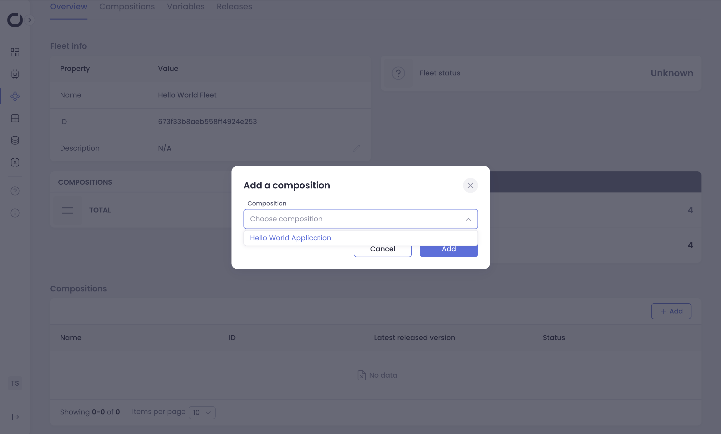 1. Back in your fleet’s Compositions tab, select your Hello World application and click Restart composition. This restarts the containers, applying the new variable.