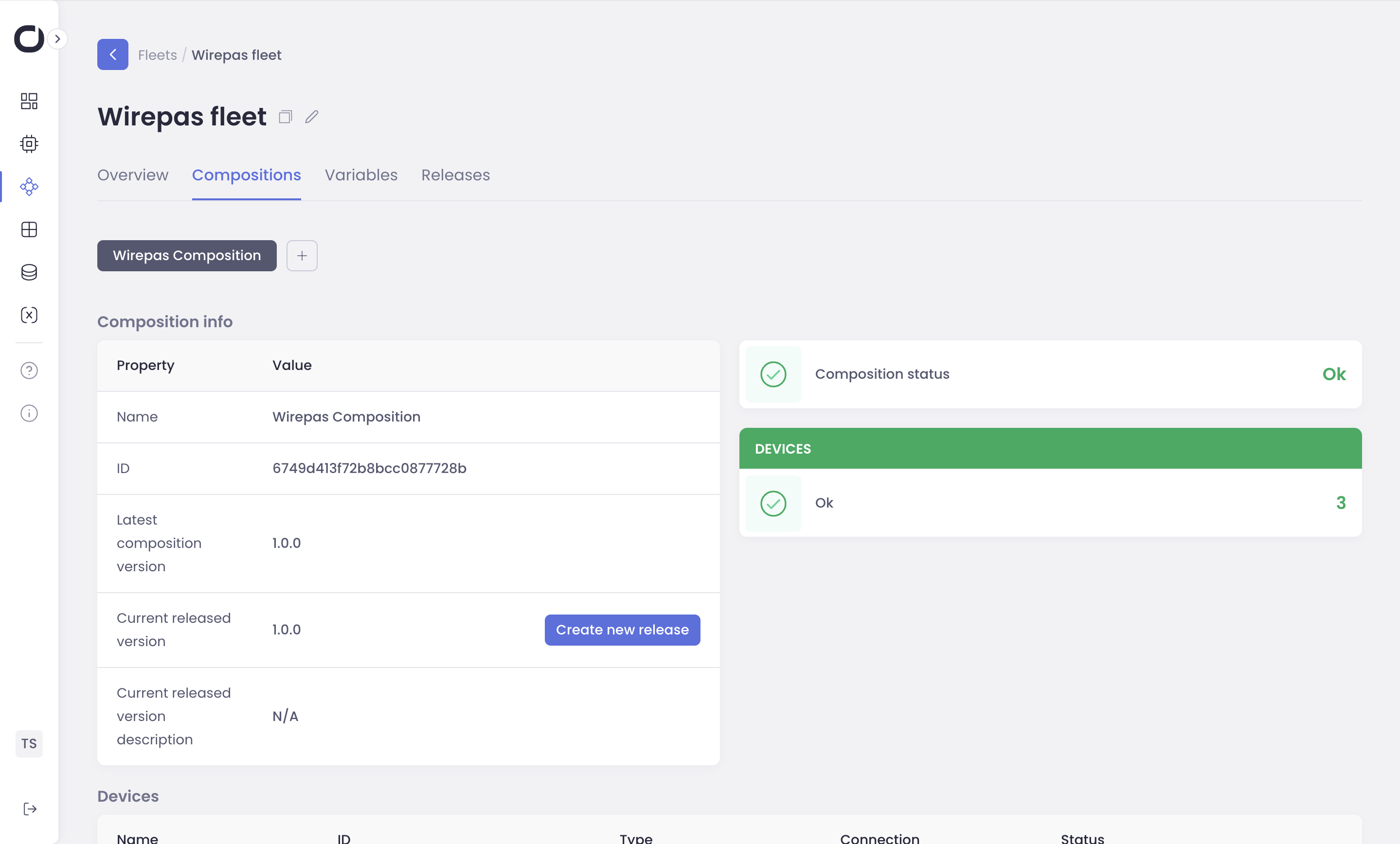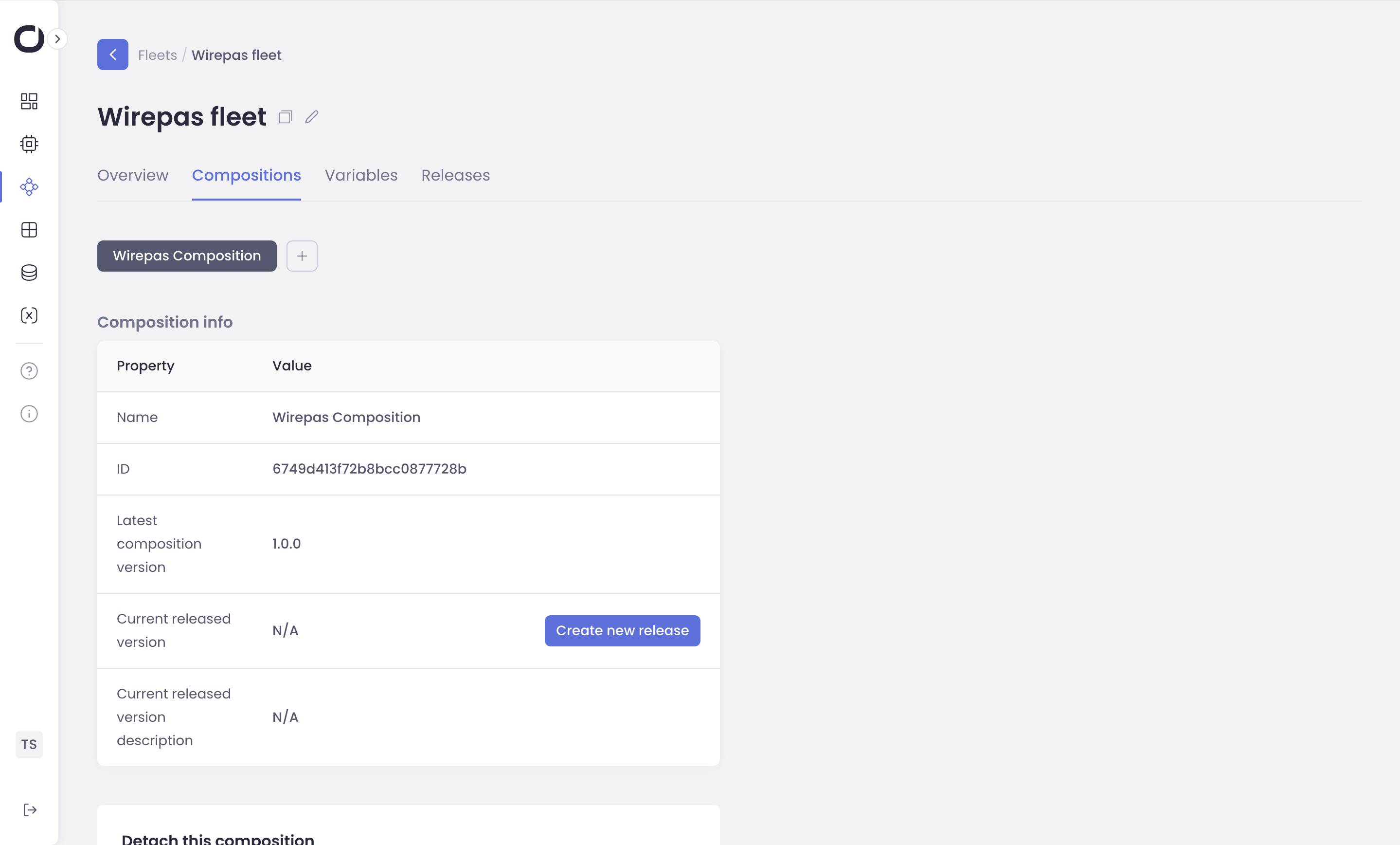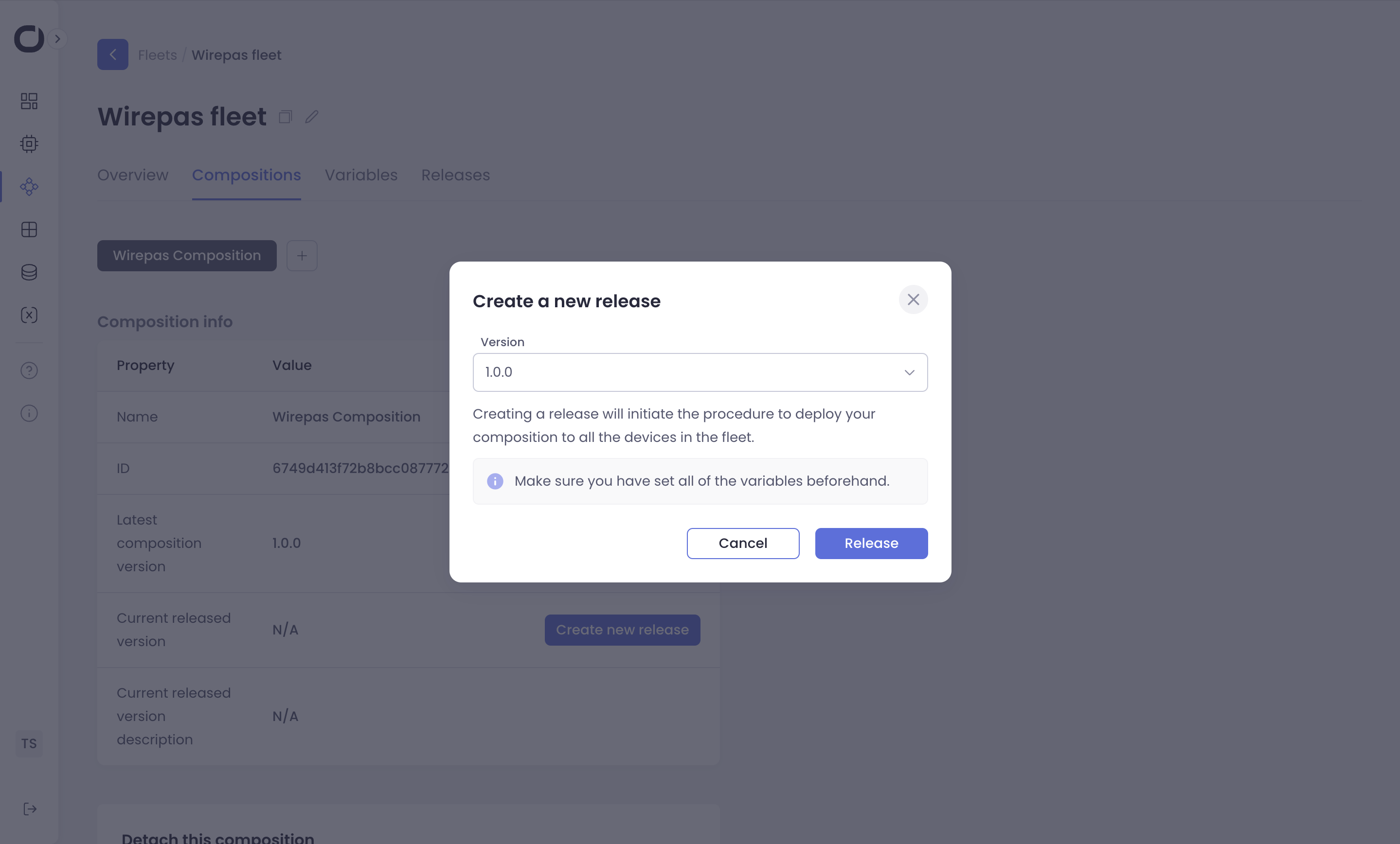 2. Select and Release: Choose your Wirepas composition and click “Create new release”.