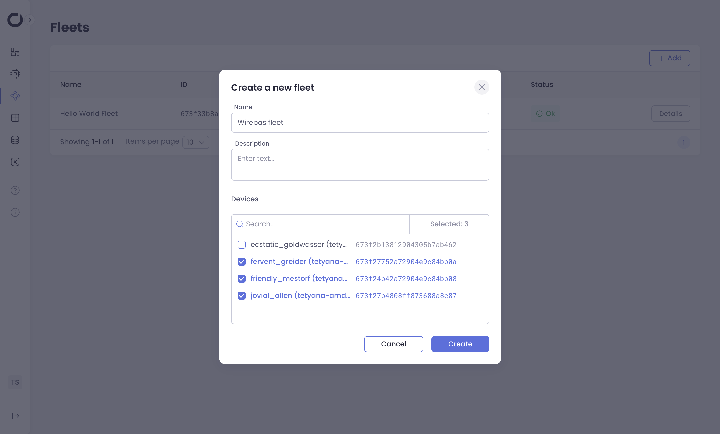 4. Configure the Fleet: Give your fleet a descriptive name and select the target devices for your Wirepas deployment.